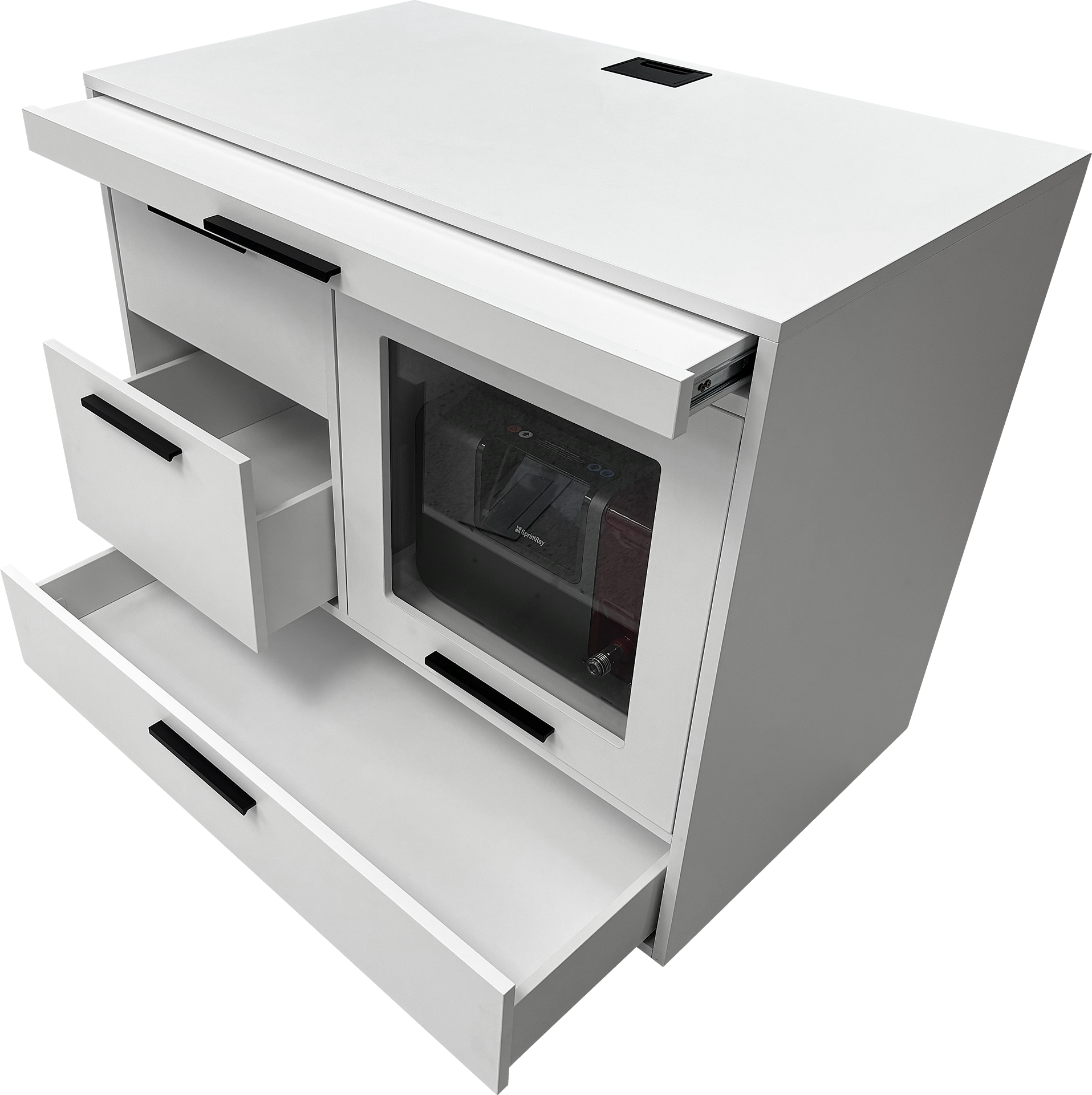 - perfektne zorganizované zásoby – skrinka obsahuje zásuvky špeciálne prispôsobené pre tlačové živice, príslušenstvo k SprintRay a nástroje potrebné k tlači, čo výrazne zlepšuje organizáciu práce a šetrí čas pri vyhľadávaní jednotlivých komponentov,